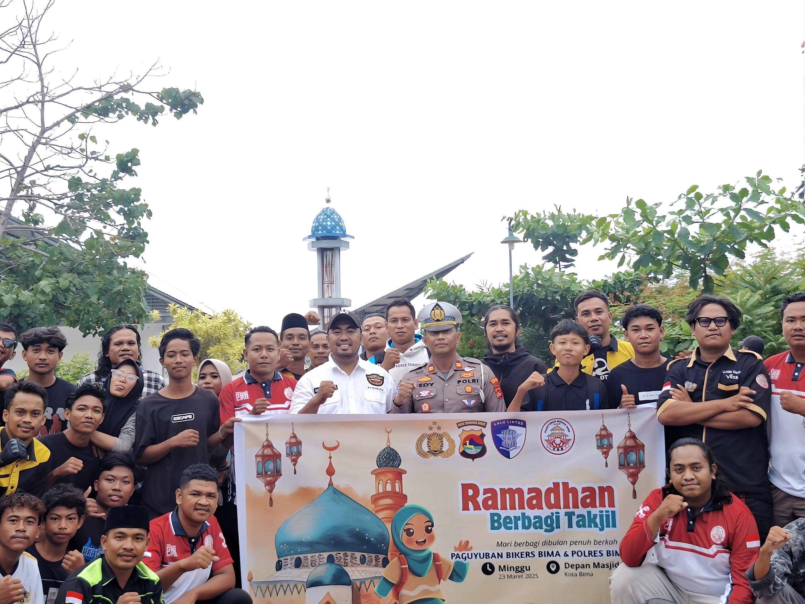 Kota Bima, NTB (24 Maret 2025) – Dalam rangka meningkatkan kesadaran berlalu lintas sekaligus berbagi di bulan suci Ramadhan, Satuan Lalu Lintas (Satlantas) Polres Bima Kota bersama Paguyuban Bikers Bima menggelar aksi simpatik dengan membagikan takjil gratis kepada masyarakat yang ngabuburit di depan Masjid Terapung Amahami, Kota Bima, Jalan Sultan Muhammad Salahuddin, pada Minggu (23/3).