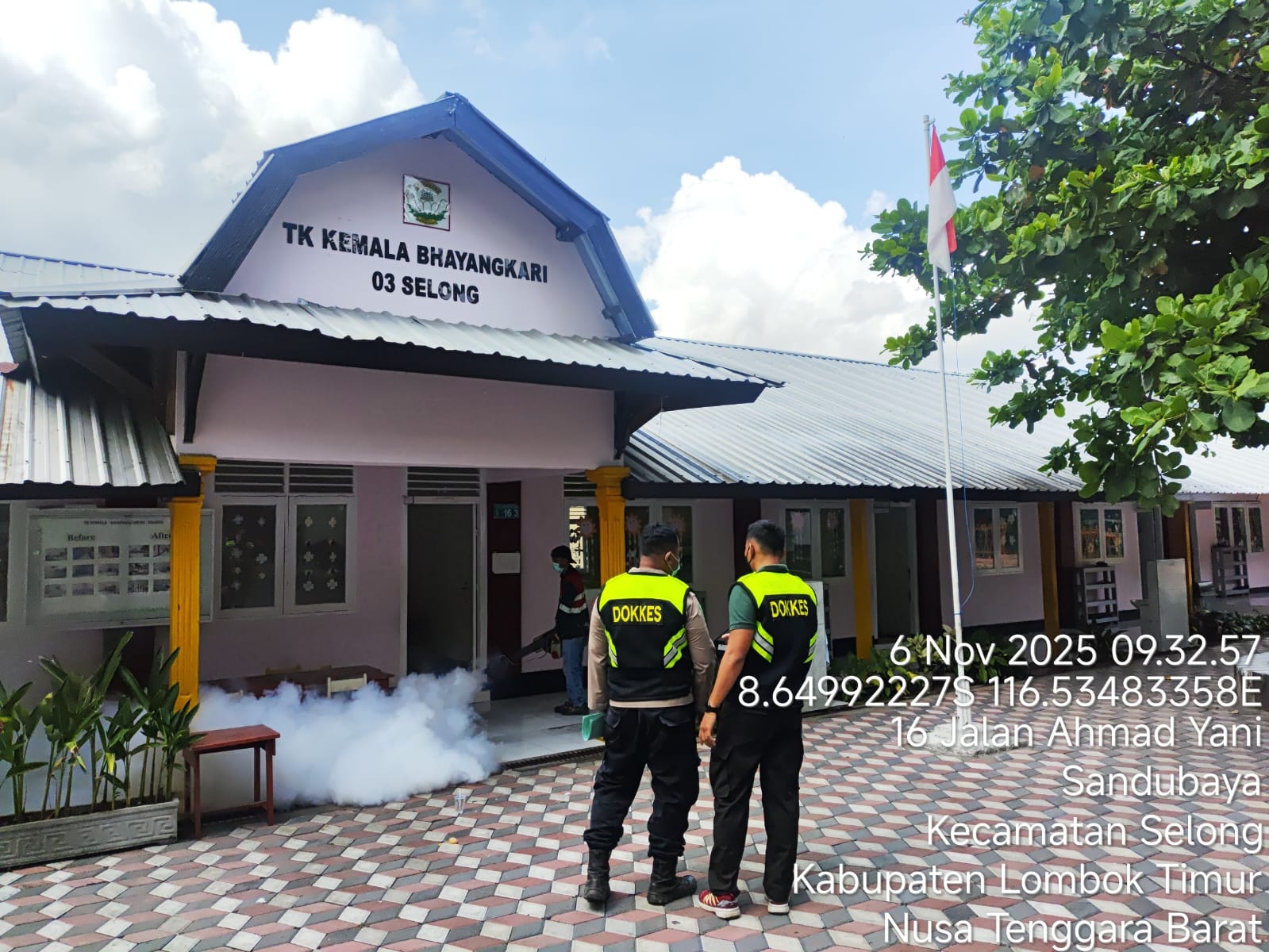 Mataram, NTB – Dalam upaya menjaga kesehatan lingkungan dan mencegah penyebaran penyakit Demam Berdarah Dengue (DBD), Bidang Kedokteran dan Kesehatan (Biddokkes) Polda NTB melaksanakan kegiatan pengasapan (fogging) di Mapolres Lombok Timur, Polsek Labuhan Haji, dan Polsek Selong, Kamis (06/11/2025).